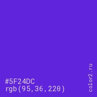 Цвет #5F24DC в цветовой модели RGB обозначается тремя октетами (95, 36, 220) в десятичном формате и #5F24DC в шестнадцатиричном (hex) формате, которые являются интенсивностью красного 95 (hex 5F), интенсивность зелёного 36 (hex 24) и интенсивность синего 220 (hex DC).