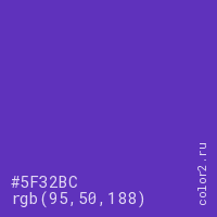 Цвет #5F32BC в цветовой модели RGB обозначается тремя октетами (95, 50, 188) в десятичном формате и #5F32BC в шестнадцатиричном (hex) формате, которые являются интенсивностью красного 95 (hex 5F), интенсивность зелёного 50 (hex 32) и интенсивность синего 188 (hex BC).