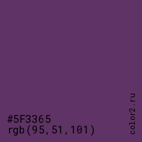 Цвет #5F3365 в цветовой модели RGB обозначается тремя октетами (95, 51, 101) в десятичном формате и #5F3365 в шестнадцатиричном (hex) формате, которые являются интенсивностью красного 95 (hex 5F), интенсивность зелёного 51 (hex 33) и интенсивность синего 101 (hex 65).