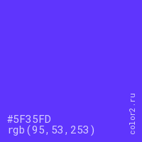 Цвет #5F35FD в цветовой модели RGB обозначается тремя октетами (95, 53, 253) в десятичном формате и #5F35FD в шестнадцатиричном (hex) формате, которые являются интенсивностью красного 95 (hex 5F), интенсивность зелёного 53 (hex 35) и интенсивность синего 253 (hex FD).