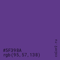 Цвет #5F398A в цветовой модели RGB обозначается тремя октетами (95, 57, 138) в десятичном формате и #5F398A в шестнадцатиричном (hex) формате, которые являются интенсивностью красного 95 (hex 5F), интенсивность зелёного 57 (hex 39) и интенсивность синего 138 (hex 8A).