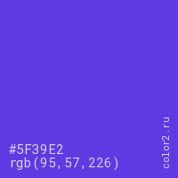 Цвет #5F39E2 в цветовой модели RGB обозначается тремя октетами (95, 57, 226) в десятичном формате и #5F39E2 в шестнадцатиричном (hex) формате, которые являются интенсивностью красного 95 (hex 5F), интенсивность зелёного 57 (hex 39) и интенсивность синего 226 (hex E2).