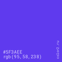 Цвет #5F3AEE в цветовой модели RGB обозначается тремя октетами (95, 58, 238) в десятичном формате и #5F3AEE в шестнадцатиричном (hex) формате, которые являются интенсивностью красного 95 (hex 5F), интенсивность зелёного 58 (hex 3A) и интенсивность синего 238 (hex EE).