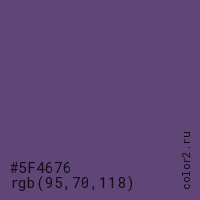 Цвет #5F4676 в цветовой модели RGB обозначается тремя октетами (95, 70, 118) в десятичном формате и #5F4676 в шестнадцатиричном (hex) формате, которые являются интенсивностью красного 95 (hex 5F), интенсивность зелёного 70 (hex 46) и интенсивность синего 118 (hex 76).