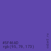 Цвет #5F46AD в цветовой модели RGB обозначается тремя октетами (95, 70, 173) в десятичном формате и #5F46AD в шестнадцатиричном (hex) формате, которые являются интенсивностью красного 95 (hex 5F), интенсивность зелёного 70 (hex 46) и интенсивность синего 173 (hex AD).