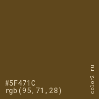 Цвет #5F471C в цветовой модели RGB обозначается тремя октетами (95, 71, 28) в десятичном формате и #5F471C в шестнадцатиричном (hex) формате, которые являются интенсивностью красного 95 (hex 5F), интенсивность зелёного 71 (hex 47) и интенсивность синего 28 (hex 1C).