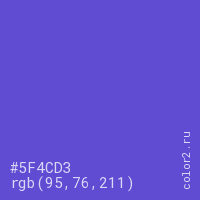 Цвет #5F4CD3 в цветовой модели RGB обозначается тремя октетами (95, 76, 211) в десятичном формате и #5F4CD3 в шестнадцатиричном (hex) формате, которые являются интенсивностью красного 95 (hex 5F), интенсивность зелёного 76 (hex 4C) и интенсивность синего 211 (hex D3).