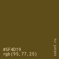 Цвет #5F4D19 в цветовой модели RGB обозначается тремя октетами (95, 77, 25) в десятичном формате и #5F4D19 в шестнадцатиричном (hex) формате, которые являются интенсивностью красного 95 (hex 5F), интенсивность зелёного 77 (hex 4D) и интенсивность синего 25 (hex 19).