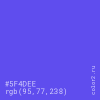 Цвет #5F4DEE в цветовой модели RGB обозначается тремя октетами (95, 77, 238) в десятичном формате и #5F4DEE в шестнадцатиричном (hex) формате, которые являются интенсивностью красного 95 (hex 5F), интенсивность зелёного 77 (hex 4D) и интенсивность синего 238 (hex EE).