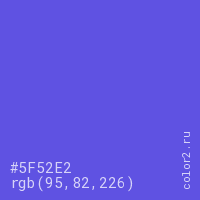 Цвет #5F52E2 в цветовой модели RGB обозначается тремя октетами (95, 82, 226) в десятичном формате и #5F52E2 в шестнадцатиричном (hex) формате, которые являются интенсивностью красного 95 (hex 5F), интенсивность зелёного 82 (hex 52) и интенсивность синего 226 (hex E2).