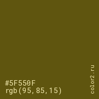 Цвет #5F550F в цветовой модели RGB обозначается тремя октетами (95, 85, 15) в десятичном формате и #5F550F в шестнадцатиричном (hex) формате, которые являются интенсивностью красного 95 (hex 5F), интенсивность зелёного 85 (hex 55) и интенсивность синего 15 (hex 0F).