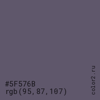 Цвет #5F576B в цветовой модели RGB обозначается тремя октетами (95, 87, 107) в десятичном формате и #5F576B в шестнадцатиричном (hex) формате, которые являются интенсивностью красного 95 (hex 5F), интенсивность зелёного 87 (hex 57) и интенсивность синего 107 (hex 6B).