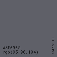 Цвет #5F6068 в цветовой модели RGB обозначается тремя октетами (95, 96, 104) в десятичном формате и #5F6068 в шестнадцатиричном (hex) формате, которые являются интенсивностью красного 95 (hex 5F), интенсивность зелёного 96 (hex 60) и интенсивность синего 104 (hex 68).