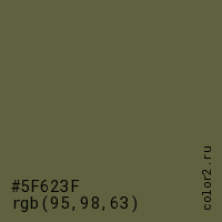 Цвет #5F623F в цветовой модели RGB обозначается тремя октетами (95, 98, 63) в десятичном формате и #5F623F в шестнадцатиричном (hex) формате, которые являются интенсивностью красного 95 (hex 5F), интенсивность зелёного 98 (hex 62) и интенсивность синего 63 (hex 3F).
