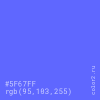 Цвет #5F67FF в цветовой модели RGB обозначается тремя октетами (95, 103, 255) в десятичном формате и #5F67FF в шестнадцатиричном (hex) формате, которые являются интенсивностью красного 95 (hex 5F), интенсивность зелёного 103 (hex 67) и интенсивность синего 255 (hex FF).
