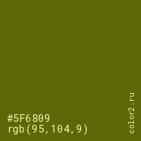 Цвет #5F6809 в цветовой модели RGB обозначается тремя октетами (95, 104, 9) в десятичном формате и #5F6809 в шестнадцатиричном (hex) формате, которые являются интенсивностью красного 95 (hex 5F), интенсивность зелёного 104 (hex 68) и интенсивность синего 9 (hex 09).