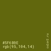 Цвет #5F680E в цветовой модели RGB обозначается тремя октетами (95, 104, 14) в десятичном формате и #5F680E в шестнадцатиричном (hex) формате, которые являются интенсивностью красного 95 (hex 5F), интенсивность зелёного 104 (hex 68) и интенсивность синего 14 (hex 0E).