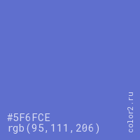 Цвет #5F6FCE в цветовой модели RGB обозначается тремя октетами (95, 111, 206) в десятичном формате и #5F6FCE в шестнадцатиричном (hex) формате, которые являются интенсивностью красного 95 (hex 5F), интенсивность зелёного 111 (hex 6F) и интенсивность синего 206 (hex CE).