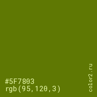 Цвет #5F7803 в цветовой модели RGB обозначается тремя октетами (95, 120, 3) в десятичном формате и #5F7803 в шестнадцатиричном (hex) формате, которые являются интенсивностью красного 95 (hex 5F), интенсивность зелёного 120 (hex 78) и интенсивность синего 3 (hex 03).