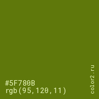 Цвет #5F780B в цветовой модели RGB обозначается тремя октетами (95, 120, 11) в десятичном формате и #5F780B в шестнадцатиричном (hex) формате, которые являются интенсивностью красного 95 (hex 5F), интенсивность зелёного 120 (hex 78) и интенсивность синего 11 (hex 0B).
