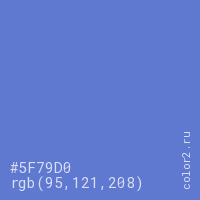 Цвет #5F79D0 в цветовой модели RGB обозначается тремя октетами (95, 121, 208) в десятичном формате и #5F79D0 в шестнадцатиричном (hex) формате, которые являются интенсивностью красного 95 (hex 5F), интенсивность зелёного 121 (hex 79) и интенсивность синего 208 (hex D0).