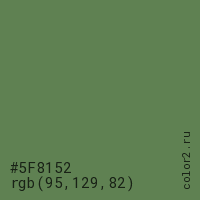 Цвет #5F8152 в цветовой модели RGB обозначается тремя октетами (95, 129, 82) в десятичном формате и #5F8152 в шестнадцатиричном (hex) формате, которые являются интенсивностью красного 95 (hex 5F), интенсивность зелёного 129 (hex 81) и интенсивность синего 82 (hex 52).