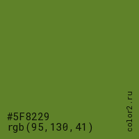 Цвет #5F8229 в цветовой модели RGB обозначается тремя октетами (95, 130, 41) в десятичном формате и #5F8229 в шестнадцатиричном (hex) формате, которые являются интенсивностью красного 95 (hex 5F), интенсивность зелёного 130 (hex 82) и интенсивность синего 41 (hex 29).