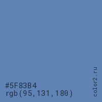Цвет #5F83B4 в цветовой модели RGB обозначается тремя октетами (95, 131, 180) в десятичном формате и #5F83B4 в шестнадцатиричном (hex) формате, которые являются интенсивностью красного 95 (hex 5F), интенсивность зелёного 131 (hex 83) и интенсивность синего 180 (hex B4).