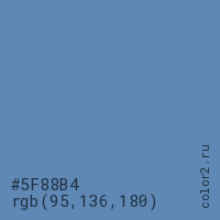 Цвет #5F88B4 в цветовой модели RGB обозначается тремя октетами (95, 136, 180) в десятичном формате и #5F88B4 в шестнадцатиричном (hex) формате, которые являются интенсивностью красного 95 (hex 5F), интенсивность зелёного 136 (hex 88) и интенсивность синего 180 (hex B4).