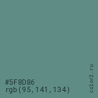 Цвет #5F8D86 в цветовой модели RGB обозначается тремя октетами (95, 141, 134) в десятичном формате и #5F8D86 в шестнадцатиричном (hex) формате, которые являются интенсивностью красного 95 (hex 5F), интенсивность зелёного 141 (hex 8D) и интенсивность синего 134 (hex 86).