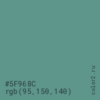 Цвет #5F968C в цветовой модели RGB обозначается тремя октетами (95, 150, 140) в десятичном формате и #5F968C в шестнадцатиричном (hex) формате, которые являются интенсивностью красного 95 (hex 5F), интенсивность зелёного 150 (hex 96) и интенсивность синего 140 (hex 8C).