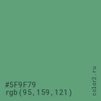 Цвет #5F9F79 в цветовой модели RGB обозначается тремя октетами (95, 159, 121) в десятичном формате и #5F9F79 в шестнадцатиричном (hex) формате, которые являются интенсивностью красного 95 (hex 5F), интенсивность зелёного 159 (hex 9F) и интенсивность синего 121 (hex 79).