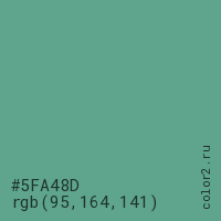 Цвет #5FA48D в цветовой модели RGB обозначается тремя октетами (95, 164, 141) в десятичном формате и #5FA48D в шестнадцатиричном (hex) формате, которые являются интенсивностью красного 95 (hex 5F), интенсивность зелёного 164 (hex A4) и интенсивность синего 141 (hex 8D).