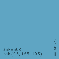 Цвет #5FA5C3 в цветовой модели RGB обозначается тремя октетами (95, 165, 195) в десятичном формате и #5FA5C3 в шестнадцатиричном (hex) формате, которые являются интенсивностью красного 95 (hex 5F), интенсивность зелёного 165 (hex A5) и интенсивность синего 195 (hex C3).