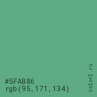 Цвет #5FAB86 в цветовой модели RGB обозначается тремя октетами (95, 171, 134) в десятичном формате и #5FAB86 в шестнадцатиричном (hex) формате, которые являются интенсивностью красного 95 (hex 5F), интенсивность зелёного 171 (hex AB) и интенсивность синего 134 (hex 86).