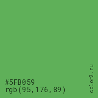 Цвет #5FB059 в цветовой модели RGB обозначается тремя октетами (95, 176, 89) в десятичном формате и #5FB059 в шестнадцатиричном (hex) формате, которые являются интенсивностью красного 95 (hex 5F), интенсивность зелёного 176 (hex B0) и интенсивность синего 89 (hex 59).