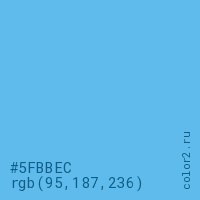Цвет #5FBBEC в цветовой модели RGB обозначается тремя октетами (95, 187, 236) в десятичном формате и #5FBBEC в шестнадцатиричном (hex) формате, которые являются интенсивностью красного 95 (hex 5F), интенсивность зелёного 187 (hex BB) и интенсивность синего 236 (hex EC).