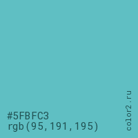Цвет #5FBFC3 в цветовой модели RGB обозначается тремя октетами (95, 191, 195) в десятичном формате и #5FBFC3 в шестнадцатиричном (hex) формате, которые являются интенсивностью красного 95 (hex 5F), интенсивность зелёного 191 (hex BF) и интенсивность синего 195 (hex C3).
