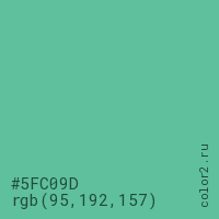 Цвет #5FC09D в цветовой модели RGB обозначается тремя октетами (95, 192, 157) в десятичном формате и #5FC09D в шестнадцатиричном (hex) формате, которые являются интенсивностью красного 95 (hex 5F), интенсивность зелёного 192 (hex C0) и интенсивность синего 157 (hex 9D).