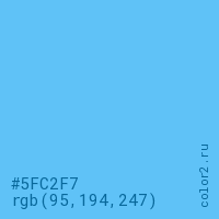 Цвет #5FC2F7 в цветовой модели RGB обозначается тремя октетами (95, 194, 247) в десятичном формате и #5FC2F7 в шестнадцатиричном (hex) формате, которые являются интенсивностью красного 95 (hex 5F), интенсивность зелёного 194 (hex C2) и интенсивность синего 247 (hex F7).