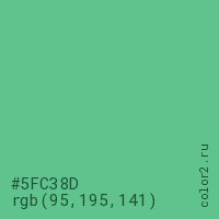 Цвет #5FC38D в цветовой модели RGB обозначается тремя октетами (95, 195, 141) в десятичном формате и #5FC38D в шестнадцатиричном (hex) формате, которые являются интенсивностью красного 95 (hex 5F), интенсивность зелёного 195 (hex C3) и интенсивность синего 141 (hex 8D).