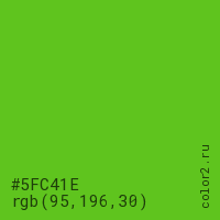 Цвет #5FC41E в цветовой модели RGB обозначается тремя октетами (95, 196, 30) в десятичном формате и #5FC41E в шестнадцатиричном (hex) формате, которые являются интенсивностью красного 95 (hex 5F), интенсивность зелёного 196 (hex C4) и интенсивность синего 30 (hex 1E).