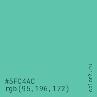 Цвет #5FC4AC в цветовой модели RGB обозначается тремя октетами (95, 196, 172) в десятичном формате и #5FC4AC в шестнадцатиричном (hex) формате, которые являются интенсивностью красного 95 (hex 5F), интенсивность зелёного 196 (hex C4) и интенсивность синего 172 (hex AC).