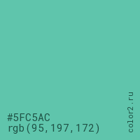 Цвет #5FC5AC в цветовой модели RGB обозначается тремя октетами (95, 197, 172) в десятичном формате и #5FC5AC в шестнадцатиричном (hex) формате, которые являются интенсивностью красного 95 (hex 5F), интенсивность зелёного 197 (hex C5) и интенсивность синего 172 (hex AC).