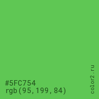 Цвет #5FC754 в цветовой модели RGB обозначается тремя октетами (95, 199, 84) в десятичном формате и #5FC754 в шестнадцатиричном (hex) формате, которые являются интенсивностью красного 95 (hex 5F), интенсивность зелёного 199 (hex C7) и интенсивность синего 84 (hex 54).