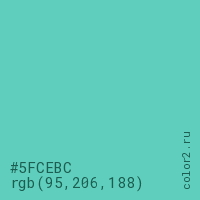 Цвет #5FCEBC в цветовой модели RGB обозначается тремя октетами (95, 206, 188) в десятичном формате и #5FCEBC в шестнадцатиричном (hex) формате, которые являются интенсивностью красного 95 (hex 5F), интенсивность зелёного 206 (hex CE) и интенсивность синего 188 (hex BC).