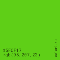 Цвет #5FCF17 в цветовой модели RGB обозначается тремя октетами (95, 207, 23) в десятичном формате и #5FCF17 в шестнадцатиричном (hex) формате, которые являются интенсивностью красного 95 (hex 5F), интенсивность зелёного 207 (hex CF) и интенсивность синего 23 (hex 17).