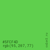 Цвет #5FCF4D в цветовой модели RGB обозначается тремя октетами (95, 207, 77) в десятичном формате и #5FCF4D в шестнадцатиричном (hex) формате, которые являются интенсивностью красного 95 (hex 5F), интенсивность зелёного 207 (hex CF) и интенсивность синего 77 (hex 4D).