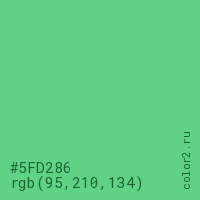 Цвет #5FD286 в цветовой модели RGB обозначается тремя октетами (95, 210, 134) в десятичном формате и #5FD286 в шестнадцатиричном (hex) формате, которые являются интенсивностью красного 95 (hex 5F), интенсивность зелёного 210 (hex D2) и интенсивность синего 134 (hex 86).