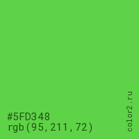 Цвет #5FD348 в цветовой модели RGB обозначается тремя октетами (95, 211, 72) в десятичном формате и #5FD348 в шестнадцатиричном (hex) формате, которые являются интенсивностью красного 95 (hex 5F), интенсивность зелёного 211 (hex D3) и интенсивность синего 72 (hex 48).